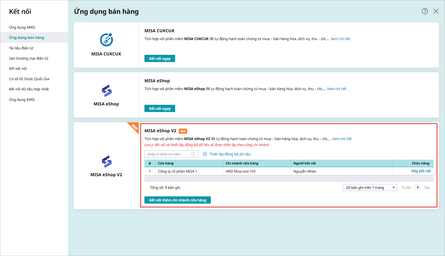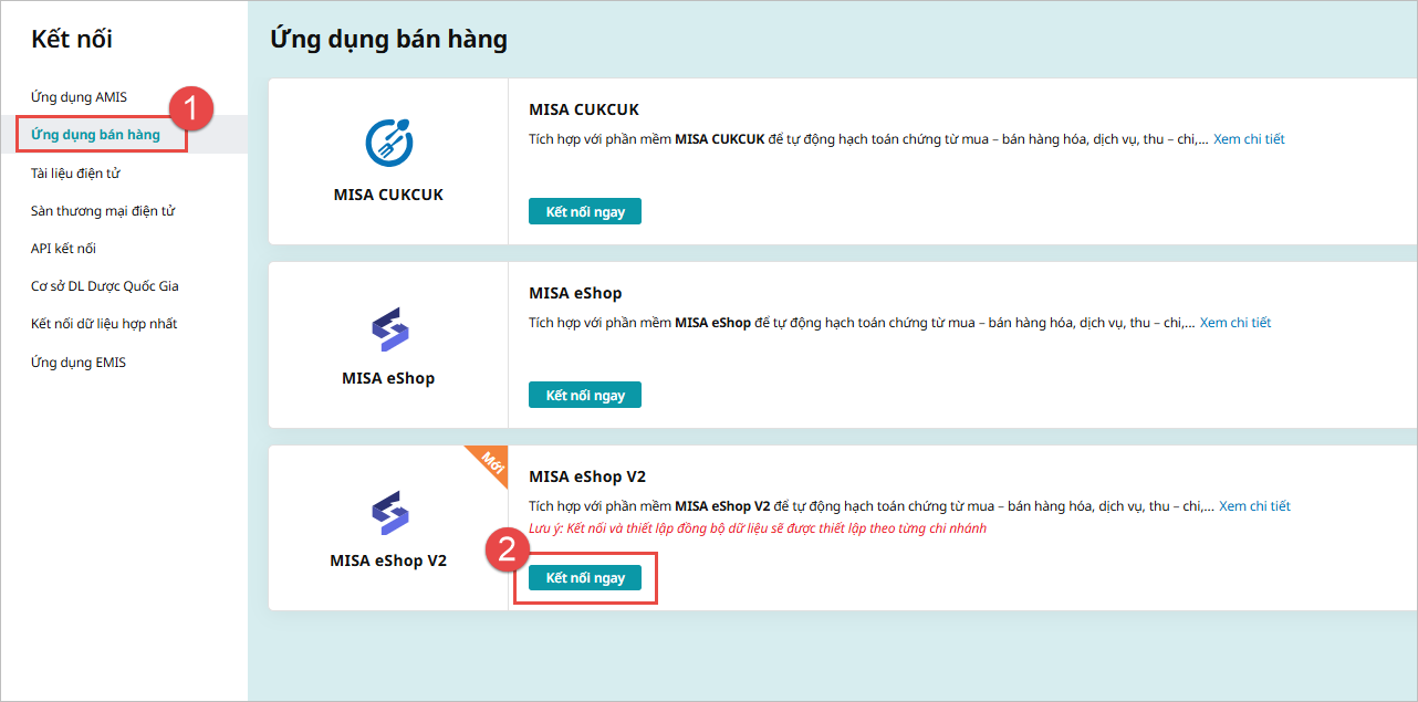 Bước 2: Vào phần Ứng dụng bán hàng, chọn phần mềm MISA eShop V2, nhấn Kết nối ngay: