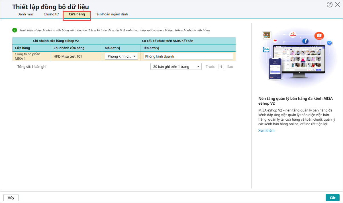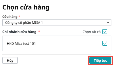 Bước 6: Tại Tab Cửa hàng, thực hiện ghép chi nhánh cửa hàng với thông tin đơn vị kế toán để quản lý doanh thu, nhập xuất và thu, chi theo từng chi nhánh cửa hàng: