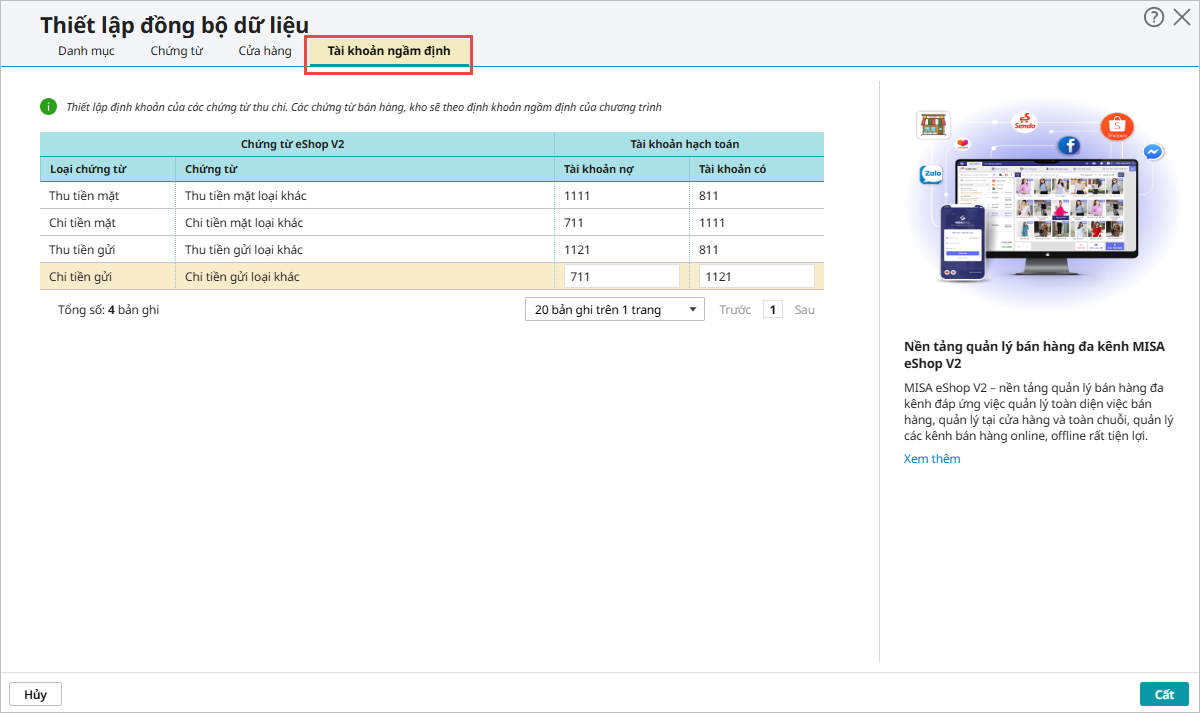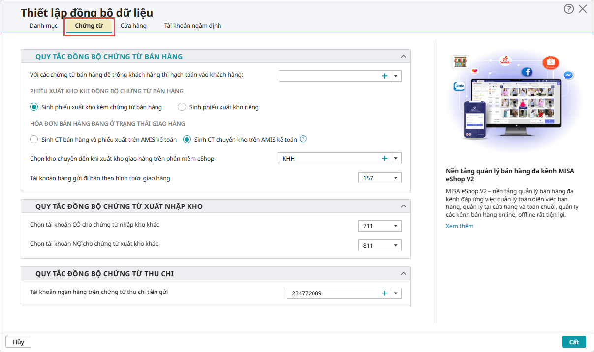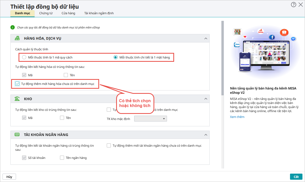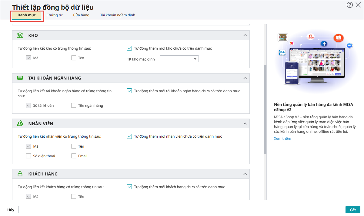 Bước 4: Tại Tab Danh mục, chọn các quy tắc để đồng bộ dữ liệu danh mục từ phần mềm eShop V2: