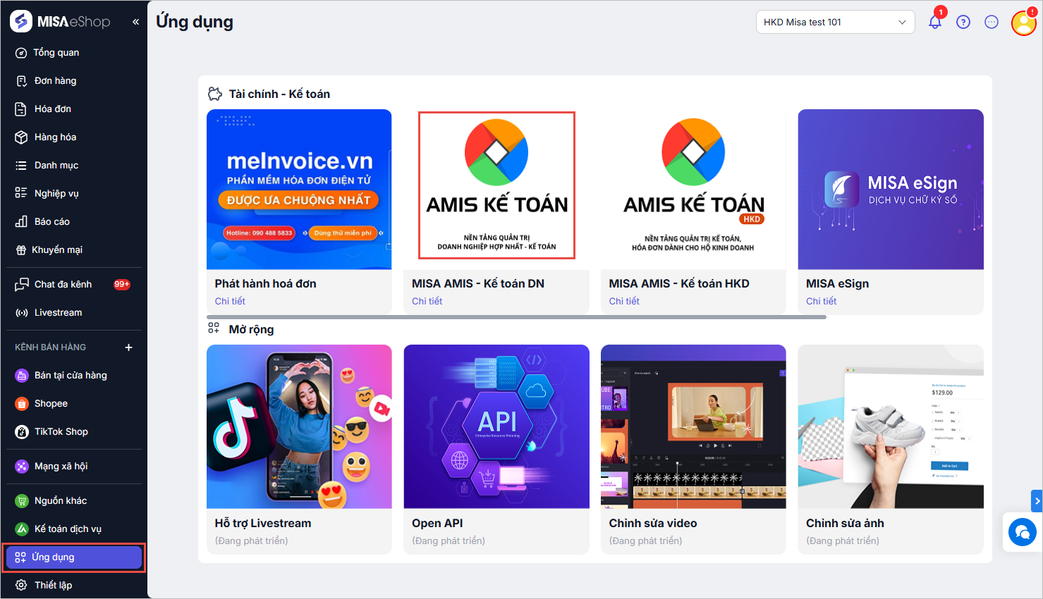 2.2. Chuyển chứng từ từ MISA eShop về Amis kế toán để tự động hạch toánBước 1: Trên MISA eShop, truy cập vào mục Ứng dụng, chọn Ứng dụng AMIS Kế toán: