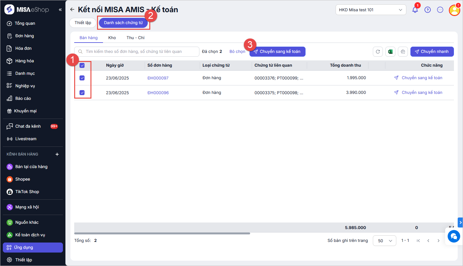 Bước 2: Tại tab Danh sách chứng từ, tích chọn các chứng từ cần chuyển sang AMIS Kế toán, sau đó chọn chức năng Chuyển sang kế toán: