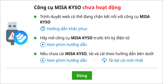 Biểu hiện: Khi thực hiện ký điện tử, chương trình hiển thị cảnh báo Công cụ MISA KYSO chưa hoạt động.