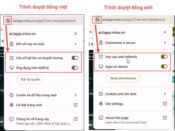 ─○ nằm bên trái thanh địa chỉ của trình duyệt, kiểm tra hai mục Cửa sổ bật lên và chuyển hướng – Pop-ups and redirects và Ứng dụng trên thiết bị – Apps on device đã được bật (màu xanh); nếu chưa, hãy gạt công tắc sang phải để bật.