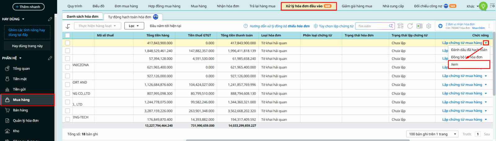 - Để xem được hóa đơn đầu vào, Vào phân hệ Mua hàng\Xử lý hóa đơn đầu vào tích đúp vào dòng hóa đơn cần xem hoặc tại cột Chức năng, chọn biểu tượng (∇), nhấn Xem