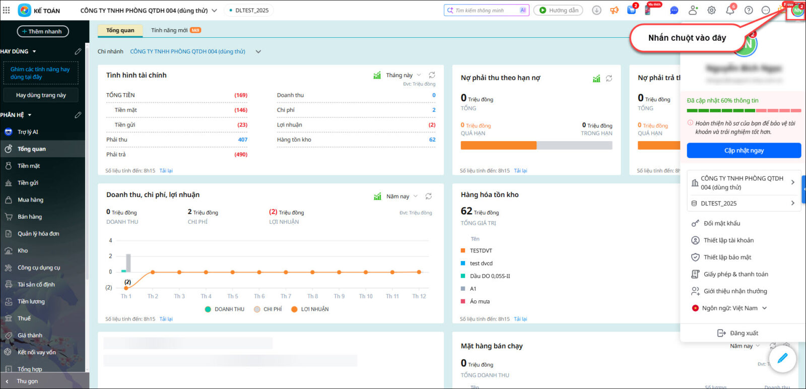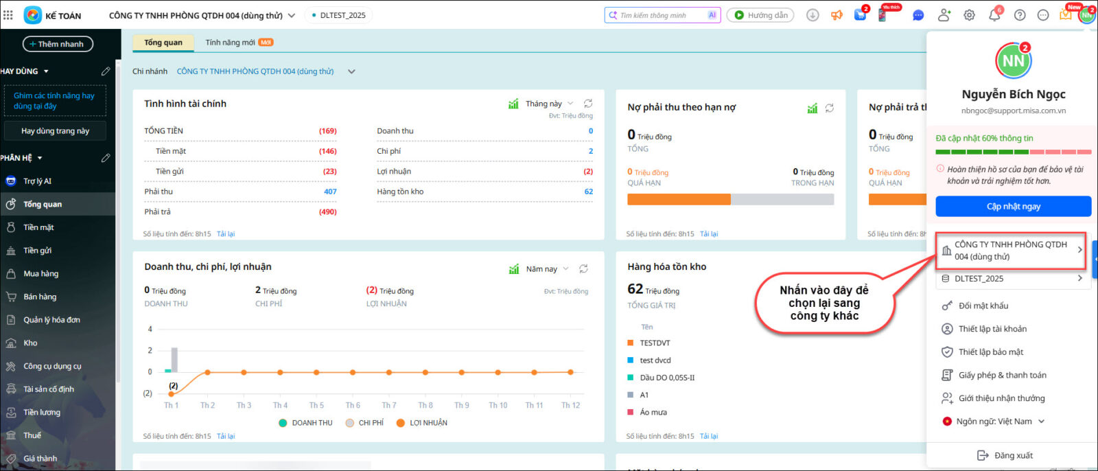 Bước 2: Nhấn vào tên công ty trên giao diện để thay đổi công ty làm việc