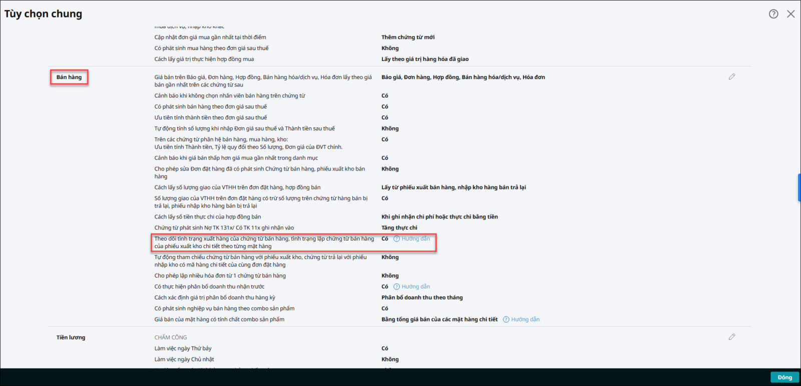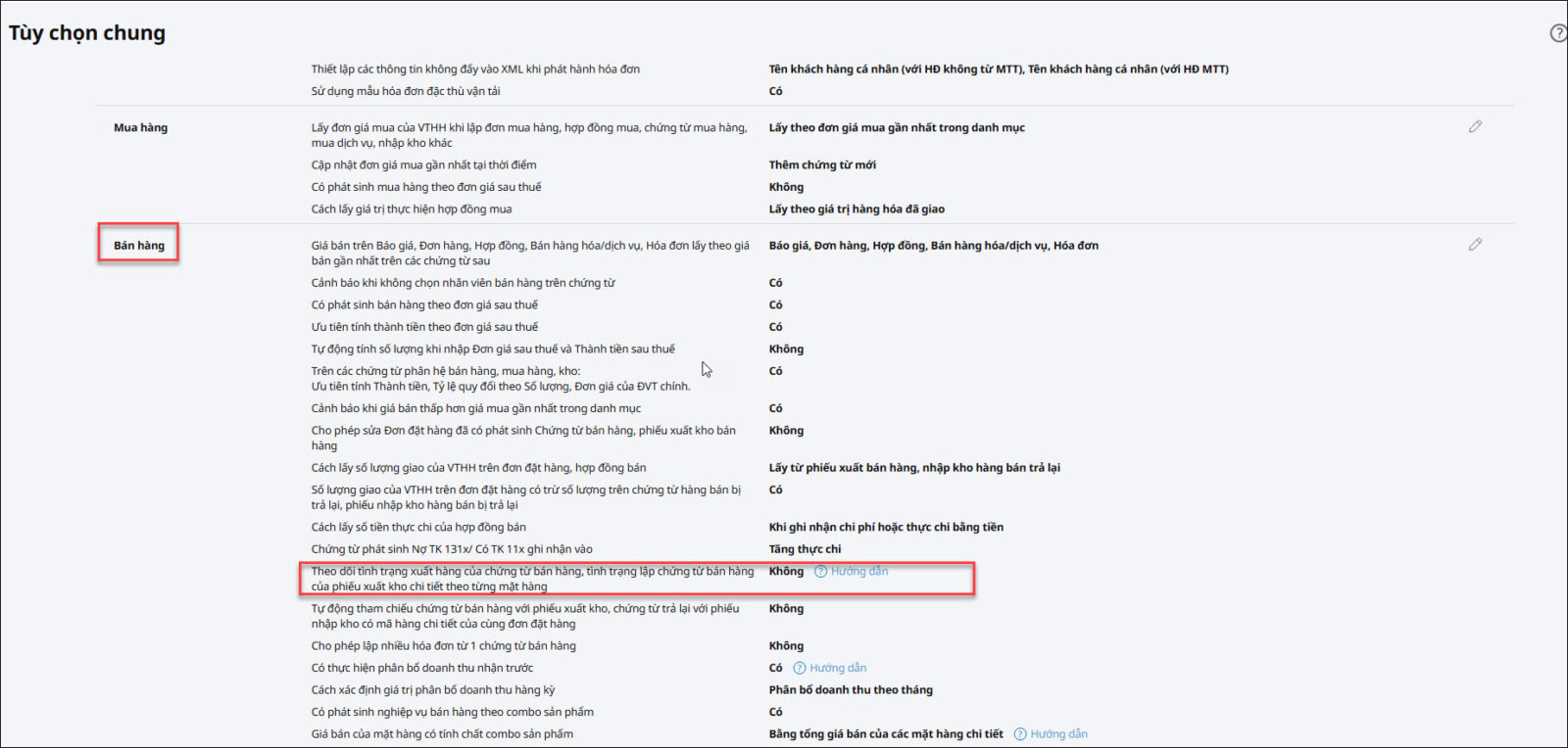 Bước 2: Tại mục Bán hàng, chọn dòng Theo dõi tình trạng xuất hàng của chứng từ bán hàng, tình trạng lập chứng từ bán hàng của phiếu xuất kho chi tiết theo từng mặt hàng là Có, nhấn Cất