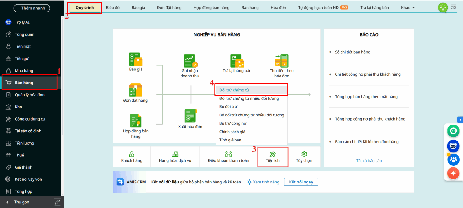 - Vào phân hệ Bán hàng, chọn tab Quy trình, chọn Tiện ích, chọn chức năng Đối trừ chứng từ