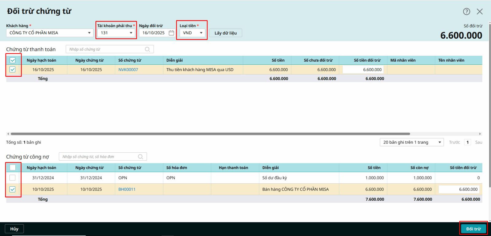 Ví dụ: Khi bán hàng ghi nhận công nợ là Loại tiền VND nhưng khi khách hàng thanh toán là Loại tiền USD, dẫn đến lúc Đối trừ chứng từ chọn loại tiền VND thì không hiển thị số liệu của Chứng từ thanh toán USD.