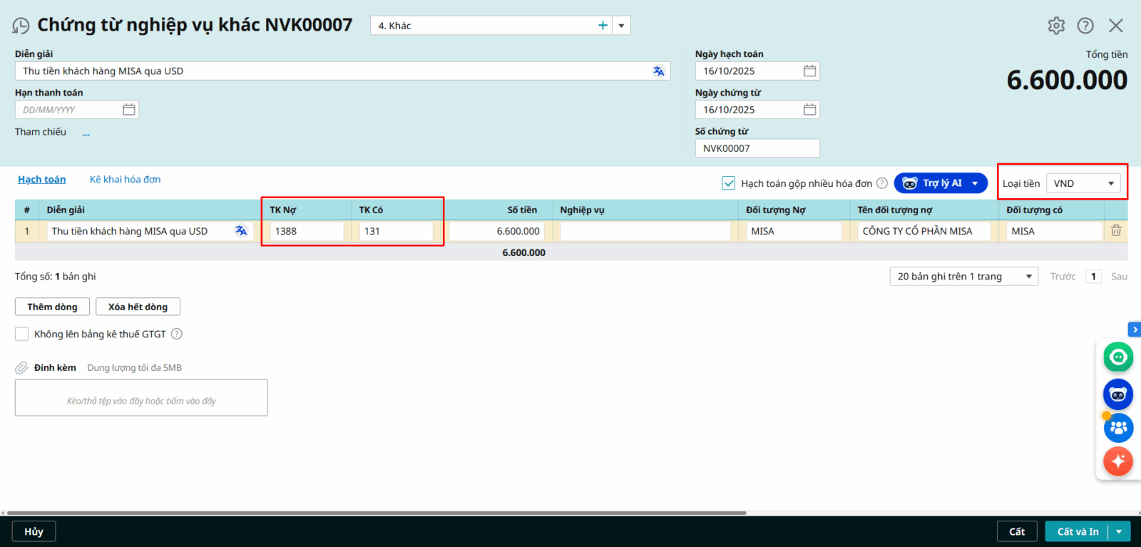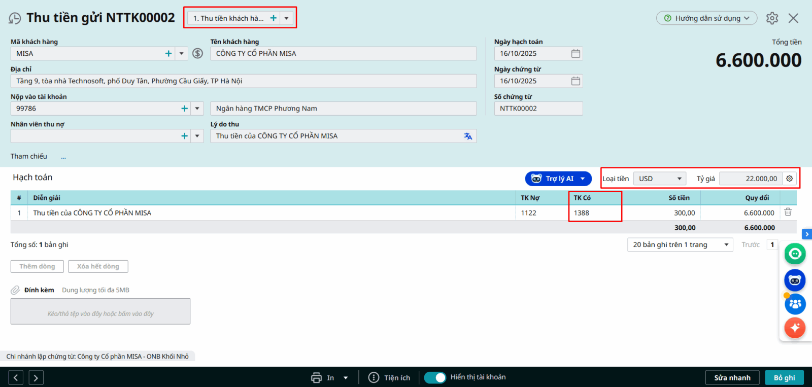 - Lưu ý sửa lại tài khoản hạch toán từ 131 thành 1388 => Nợ 111,112/ Có 1388 (chọn Loại tiền khách hàng thanh toán, ví dụ:USD)