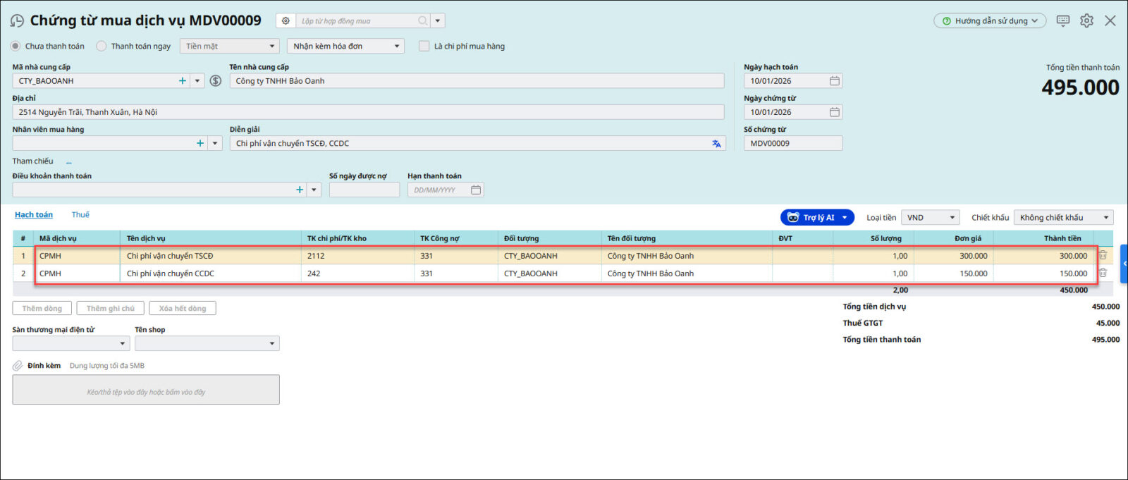 • Trên chứng từ mua dịch vụ, Anh chị tách tổng chi phí mua hàng thành từng dòng hạch toán riêng cho TSCĐ và CCDC.