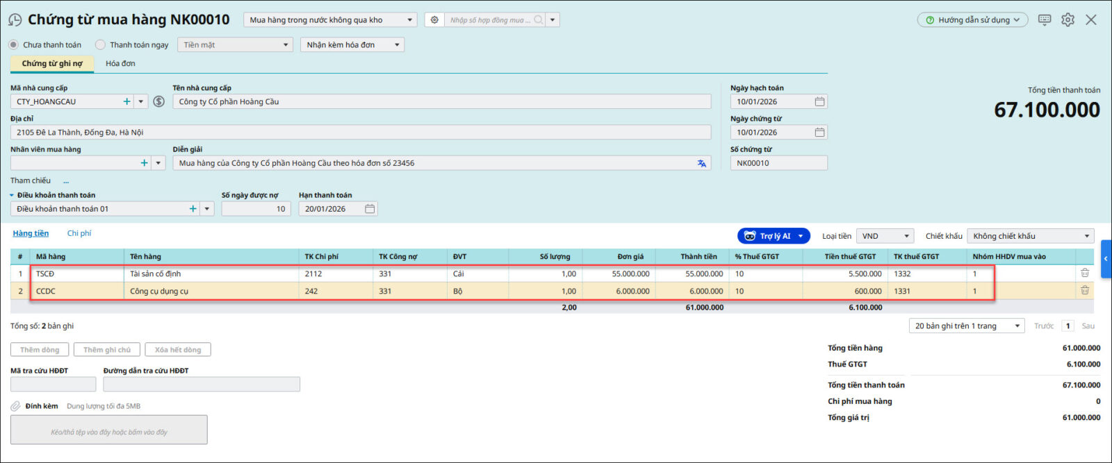 Lưu ý: Nếu mua CCDC, TSCĐ cùng 1 hóa đơn thì lập chứng từ mua hàng không qua kho tách từng dòng CCDC (Hạch toán TK242), TSCĐ (Hạch toán TK211) thành từng dòng riêng biệt