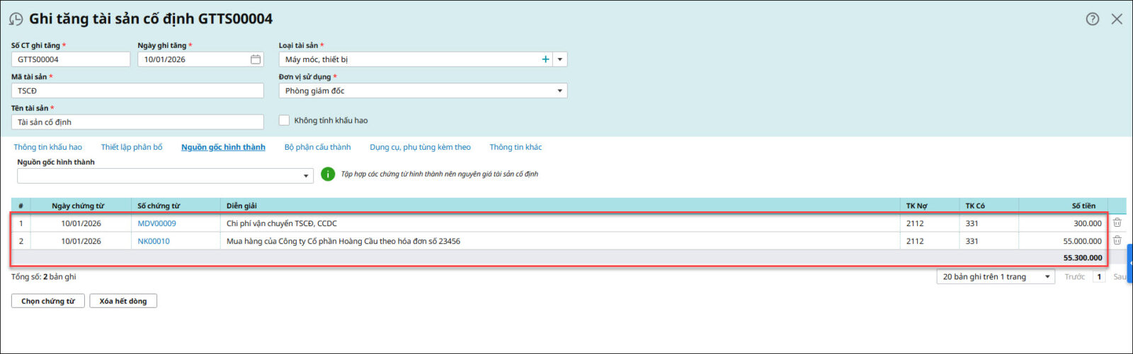 Lưu ý: Tại tab Nguồn gốc hình thành khi ghi tăng, Anh chị tích chọn cả dòng hạch toán mua TSCĐ, CCDC và dòng hạch toán chi phí liên quan TSCĐ, CCDC đó.