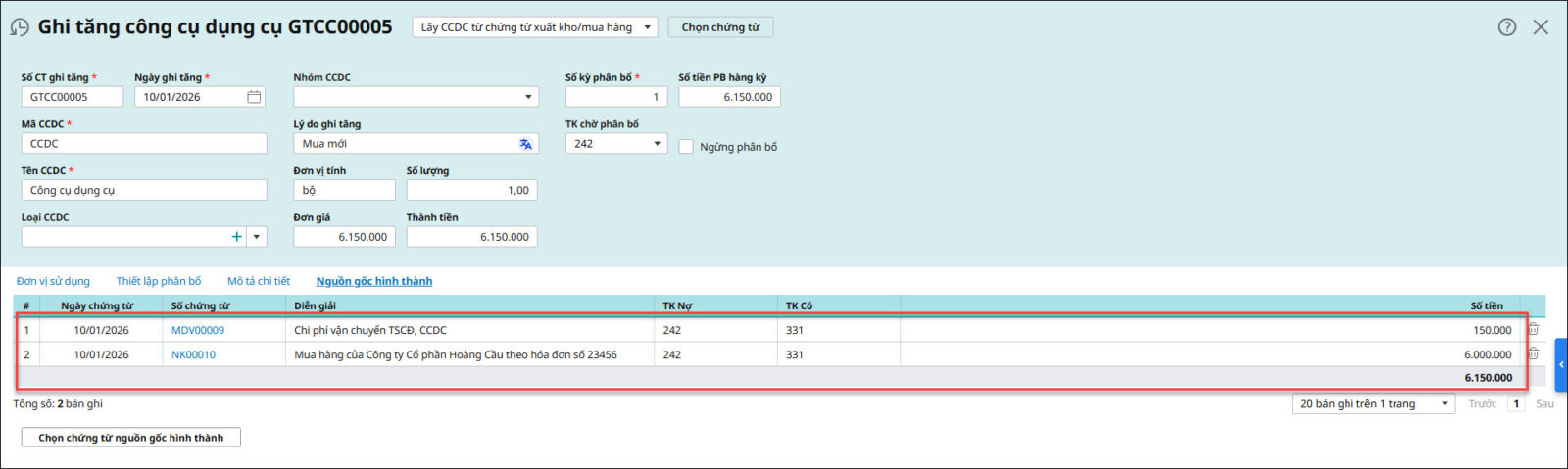 Trường hợp đơn vị mua TSCĐ, CCDC về sử dụng ngay và có phát sinh một hóa đơn chi phí mua hàng chung cho cả TSCĐ, CCDC, khi ghi tăng TSCĐ, CCDC cần chọn nguồn gốc hình thành bao gồm giá mua TSCĐ, CCDC và chi phí mua hàng.