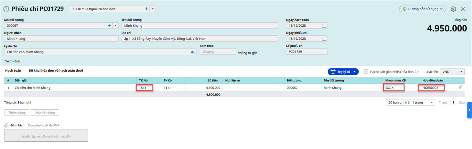 - Khai báo chứng từ phiếu chi về chi phí cho hợp đồng.