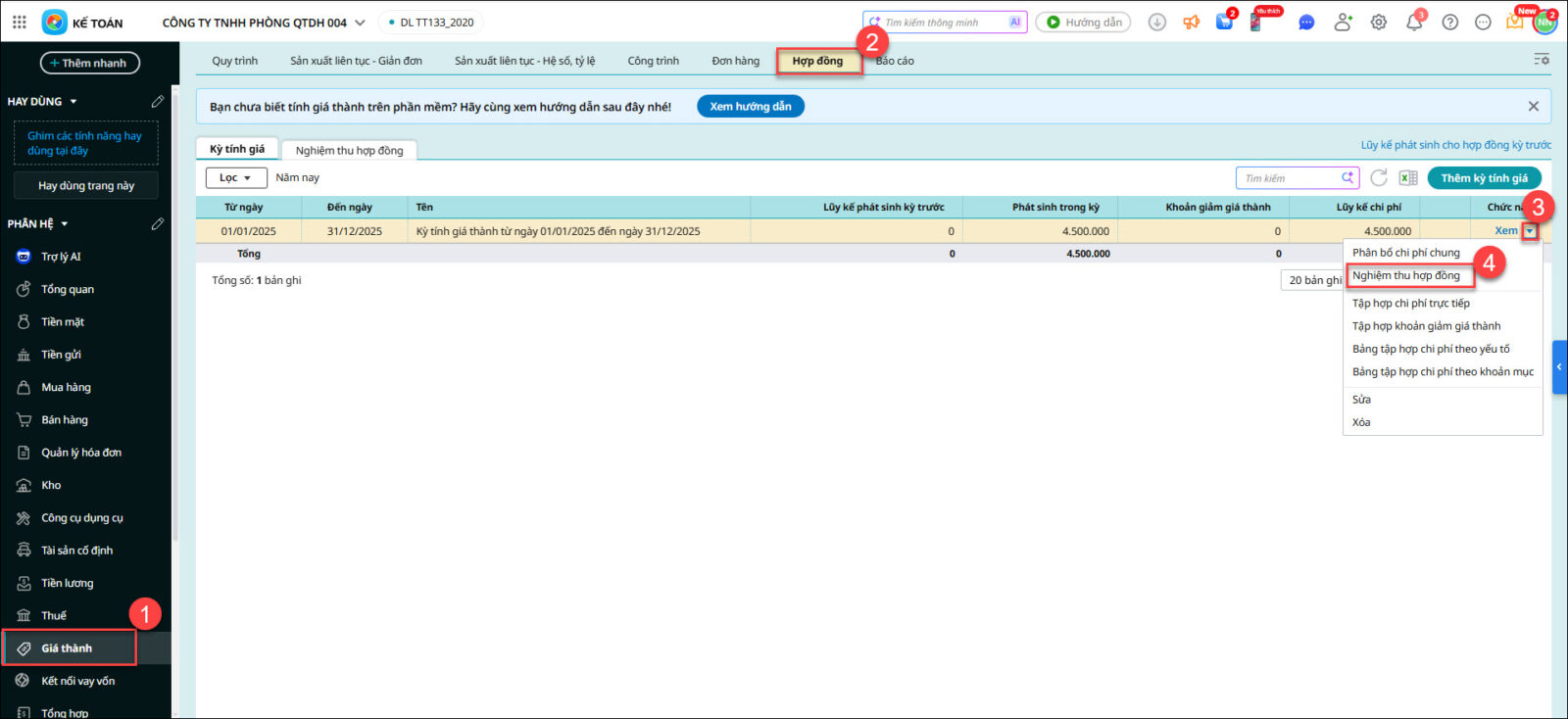 - Vào phân hệ Giá thành\tab Quy trình\tab Hợp đồng, chọn chức năng Xác định kỳ tính giá thành.