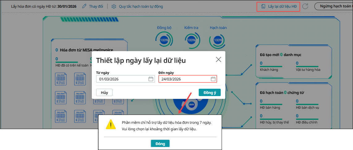 Nguyên nhân là do hệ thống chỉ hỗ trợ lấy hóa đơn tự động trong vòng 30 ngày tính từ ngày lấy hóa đơn gần nhất, nên không thể lấy hóa đơn trước khoảng thời gian này. Giải pháp: Anh/Chị thiết lập lại Ngày lấy hóa đơn theo đúng ngày mà hệ thống cảnh báo (≥ ngày được thông báo), sau đó nhấn Đồng ý để phần mềm thực hiện lấy hóa đơn. Câu hỏi 2: Khi thiết lập ngày lấy lại dữ liệu hóa đơn hệ thống hiển thị cảnh báo chỉ hỗ trợ trong 7 ngày?Khi thiết lập Ngày lấy lại dữ liệu hóa đơn, hệ thống hiển thị cảnh báo: “Phần mềm chỉ hỗ trợ lấy dữ liệu hóa đơn trong 7 ngày.”