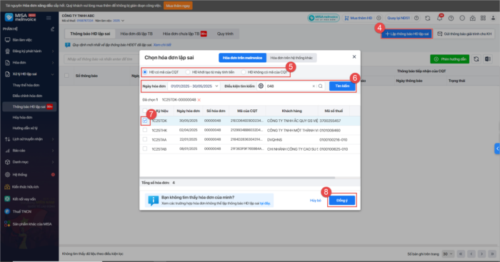 - Thiết lập thời gian chứa hóa đơn sai, nhập số hóa đơn sai và ấn Tìm kiếm.