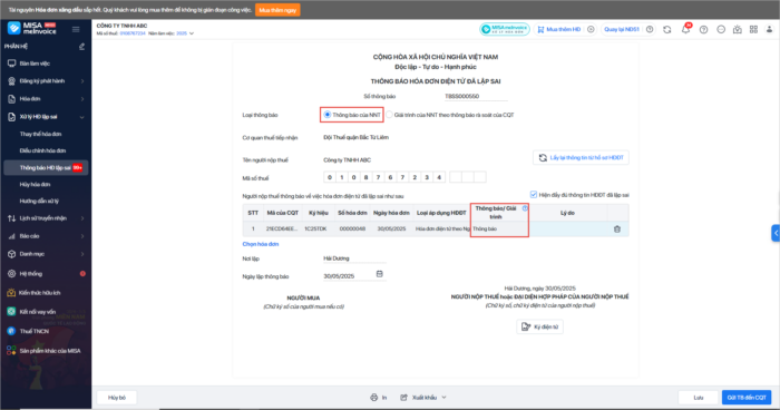 Bước 3: Chọn hóa đơn cần lập thông báo sai sót: