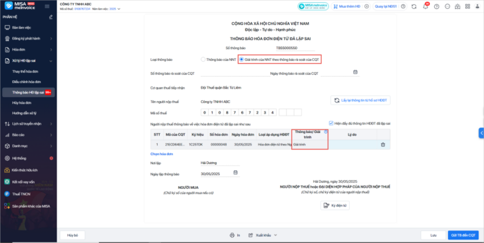 Bước 6: Nhập lý do sai, nhấn Ký điện tử và nhấn Gửi TB tới CQT.