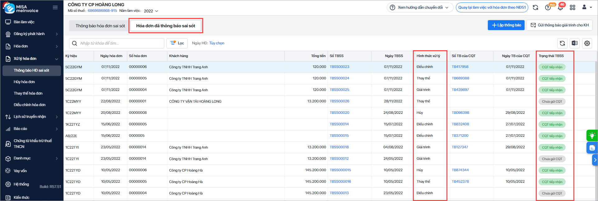 Bước 2: Chương trình sẽ tự động điều hướng sang phần mềm MISA meInvoice. Tại đây, Chọn tab “Hóa đơn đã thông báo sai sót” để xem trạng thái tiếp nhận và hình thức xử lý hóa đơn