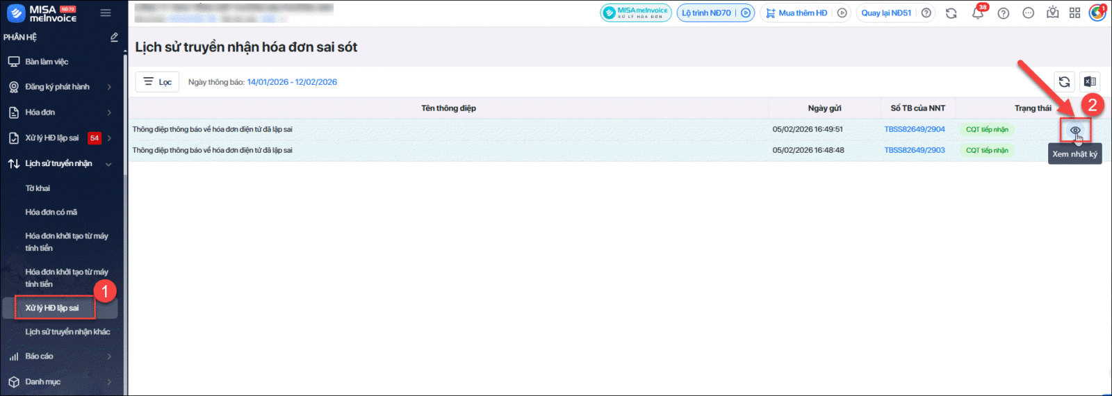 Bước 2: Trên phần mềm MeInvoice, vào Lịch sử truyền nhận \ Xử lý hóa đơn lập sai \ Tại dòng Thông báo sai sót cần kiểm tra, cột trạng thái, bấm biểu tượng “con mắt” để xem Nhật ký truyền dẫn dữ liệu