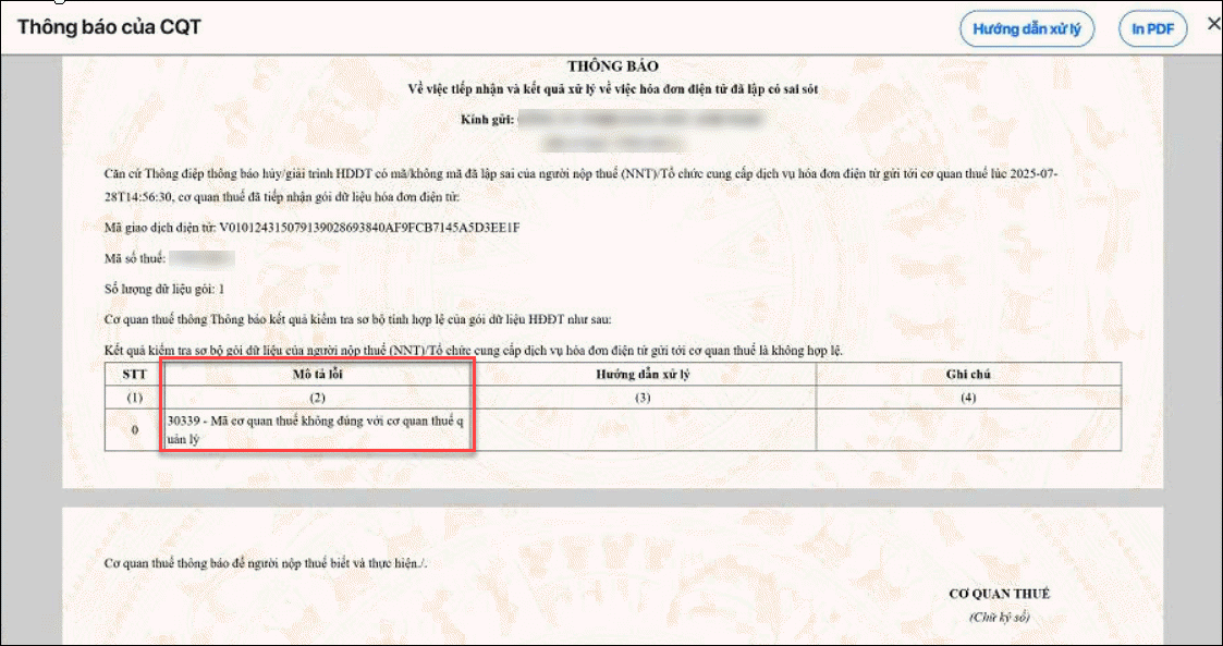 Trường hợp Thông báo sai sót không hợp lệ, Anh chị có thể kiểm tra thông báo lỗi như sau