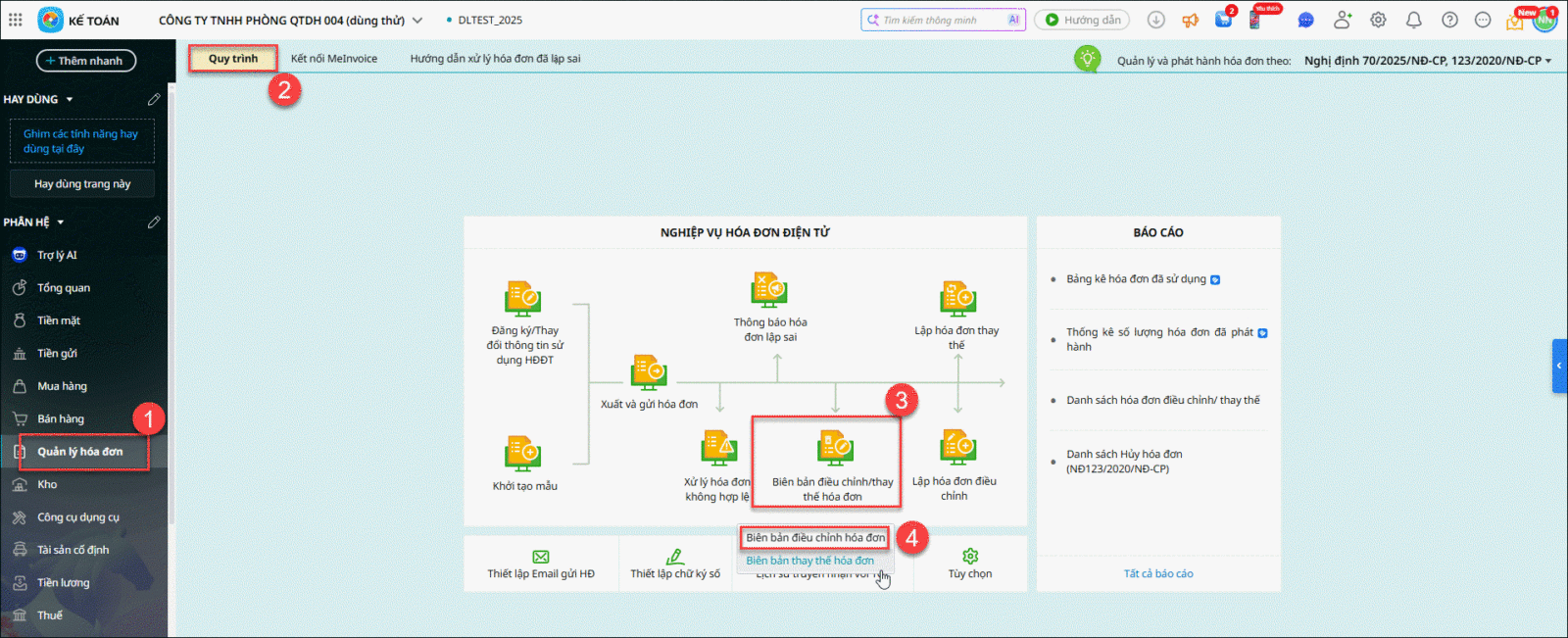 Trường hợp 3: Sửa lại biên bản điều chỉnh hóa đơn đã lậpLưu ý: Không thể sửa hoặc xóa biên bản trong trường hợp cả người bán và người mua đã ký vào biên bản. Trường hợp Biên bản điều chỉnh đã lập nhưng Khách hàng chưa ký thì có thể sửa lại biên bản theo hướng dẫn sau: Bước 1: Trên phần mềm AMIS kế toán, vào phân hệ Quản lý hóa đơn \ tab Quy trình \ Biên bản điều chỉnh/thay thế hóa đơn \ Chọn Biên bản điều chỉnh hóa đơn -> Chương trình sẽ tự động điều hướng sang phần mềm MeInvoice Web Bước 2: Trên phần mềm MeInvoice web vào Xử lý HĐ lập sai \ Điều chỉnh hóa đơn Bước 3: Nhấn vào số biên bản để mở chi tiết.