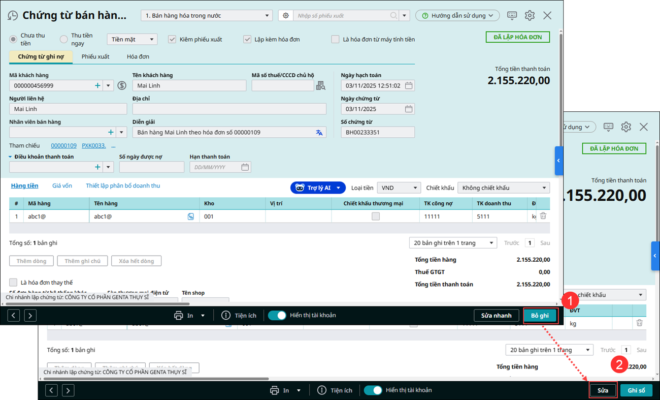 Bước 5: Nhấn Cất để lưu lại. Bước 6: Nhấn mũi tên cạnh In (▼) để xem và in các mẫu phiếu tương ứng với nghiệp vụ. 2.2 Cách Sửa chứng từĐể thay đổi thông tin chứng từ đã lập, thực hiện như sau: Bước 1: Vào phân hệ tương ứng (VD: Mua hàng, Bán hàng, Quỹ, Ngân hàng, Kho, Tổng hợp…). Chọn tab danh sách có chứng từ cần sửa. Bước 2: Nhấn đúp chuột vào chứng từ cần thay đổi để mở giao diện chi tiết. Bước 3: Nhấn Bỏ ghi rồi chọn Sửa và cập nhật các thông tin cần thay đổi: