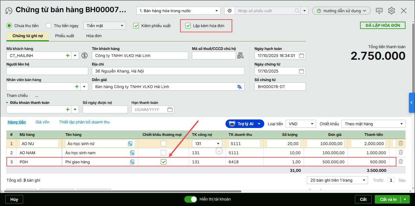 Để ghi nhận chi phí phát sinh khi bán hàng và thể hiện khoản chi phí này trên hóa đơn xuất cho khách hàng, bạn thực hiện theo các bước sau: