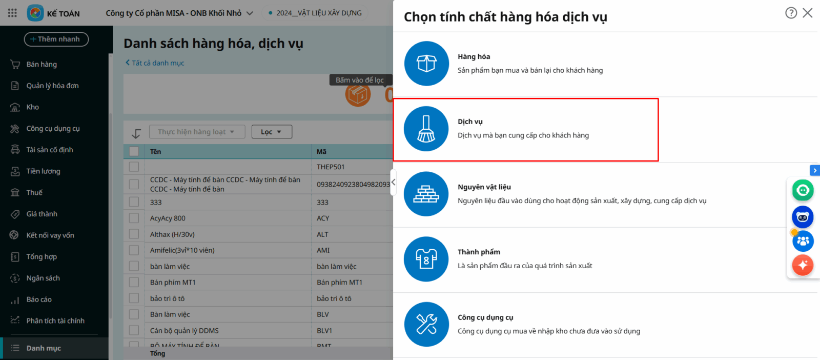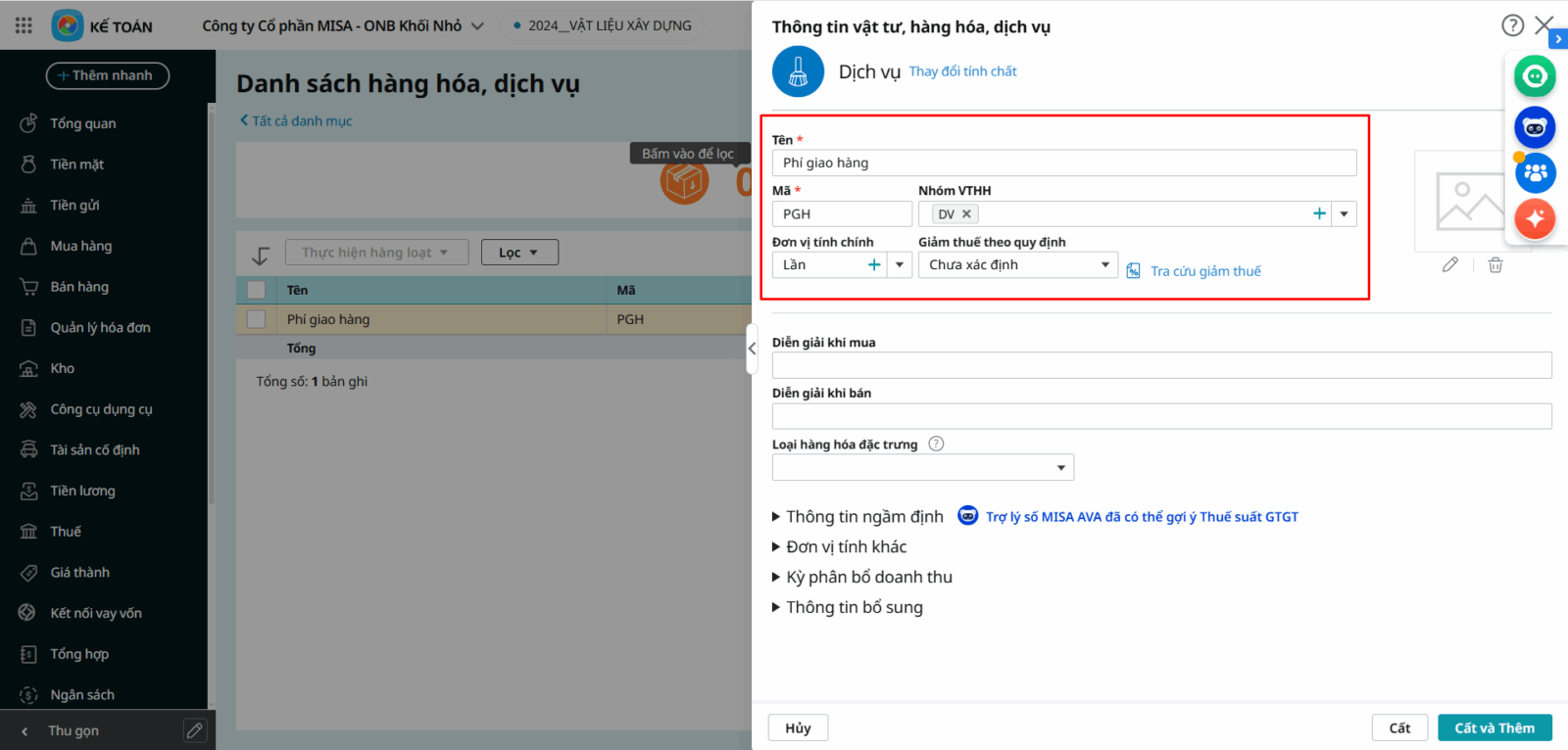 - Vào Danh mục, chọn Vật tư hàng hóa, nhấn Thêm, chọn tính chất là Dịch vụ