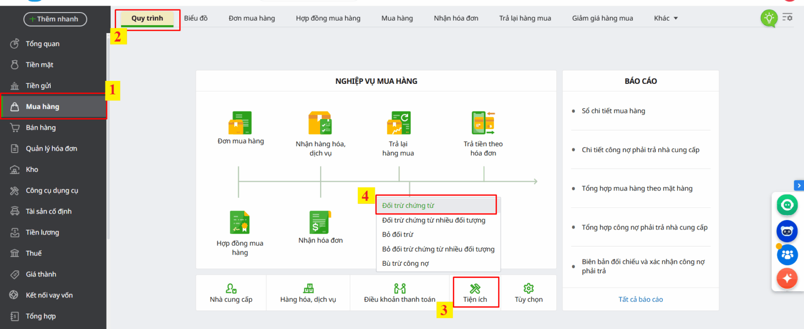 Nguyên nhân 2: Có phát sinh nghiệp vụ trả lại hàng mua chọn đến chứng từ mua hàng đã được trả tiền nhà cung cấp hoặc đã đối trừ chứng từ– Cách kiểm tra: Bước 1: Vào Mua hàng\Báo cáo\Báo cáo đối chiếu Bước 2: Mở báo cáo Đối chiếu chứng từ công nợ phải trả và chứng từ thanh toán của NCC đang bị lệch công nợ
