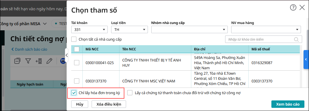 Nguyên nhân 3: Tham số đang tích chọn Chỉ lấy hóa đơn trong kỳTùy chọn này chỉ hiển thị các hóa đơn phát sinh trong kỳ (không bao gồm các hóa đơn kỳ trước còn dư) dẫn đến số dư công nợ bị chênh lệch so với báo cáo tổng hợp.