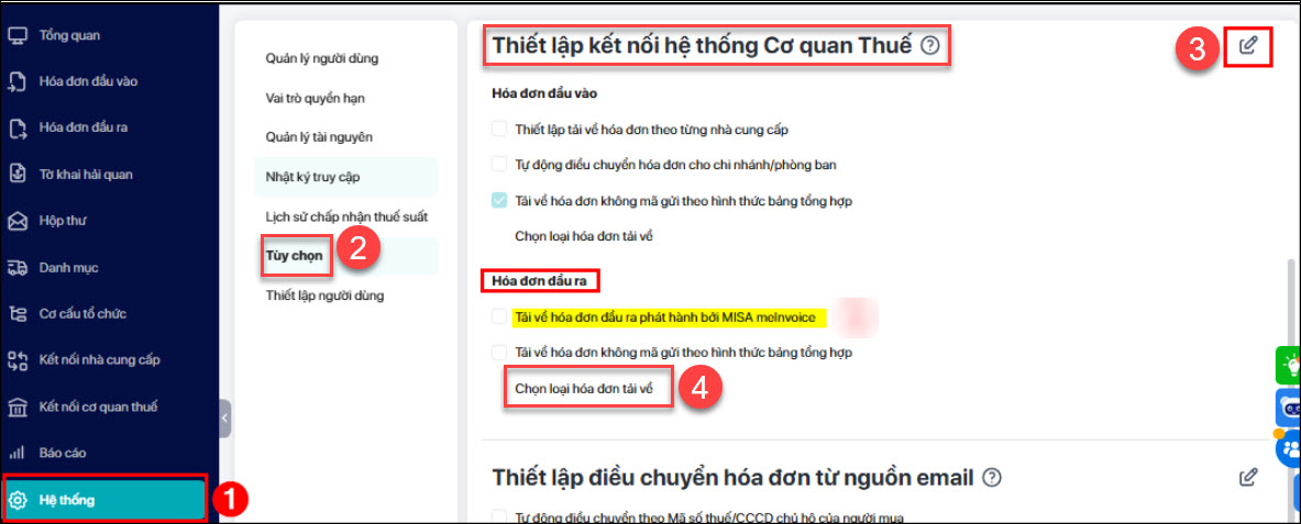 Bước 2: Vào Hệ thống\Tùy chọn\Thiết lập kết nối hệ thống cơ quan thuế\Hóa đơn đầu ra