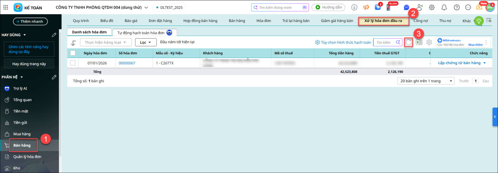 Bước 1: Vào phân hệ Bán hàng → tab Xử lý hóa đơn đầu ra.
