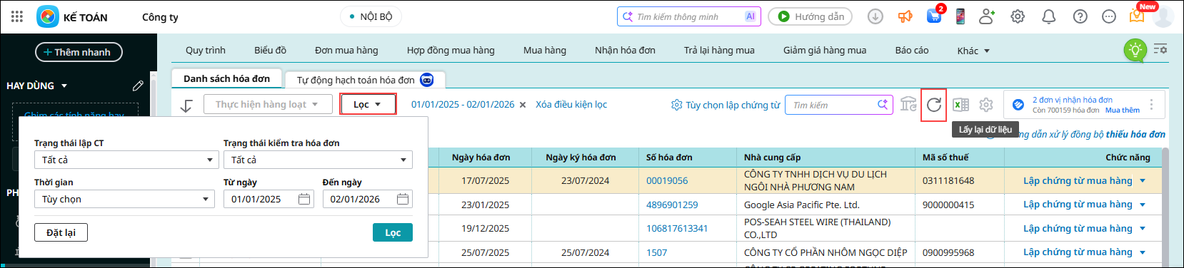 Bước 2: Nhấn biểu tượng mũi tên xoay vòng – Lấy lại dữ liệu để đồng bộ lại hóa đơn từ MeInvoice - Xử lý hóa đơn về AMIS Kế toán.