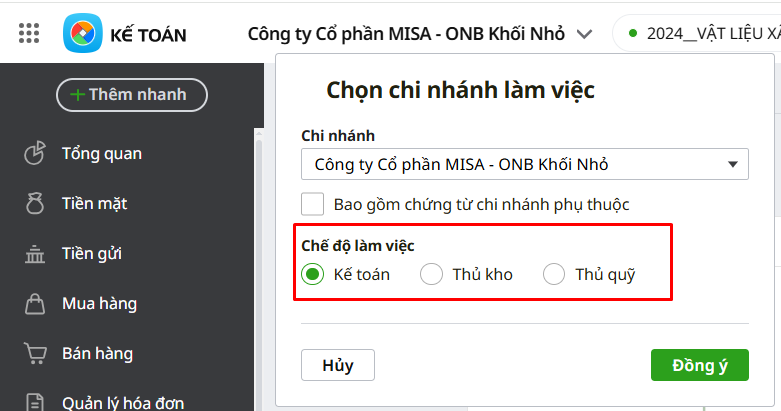 Bước 2: Tích chọn có sử dụng nghiệp vụ Thủ kho. Nhấn Cất.