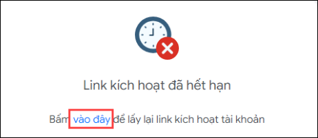 - Khi xuất hiện thông báo “Link kích hoạt đã hết hạn”, nhấn vào Vào đây để hệ thống tự động gửi lại email kích hoạt.
