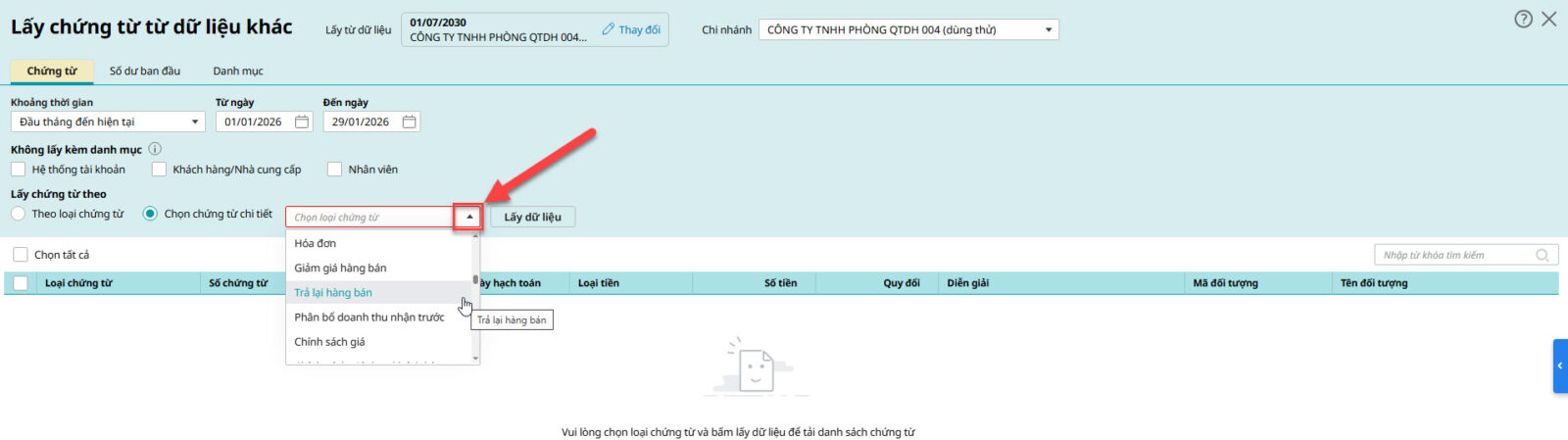 Lưu ý: Trường hợp lấy chứng từ sang dữ liệu khác mà chứng từ bán hàng thì qua nhưng hóa đơn thì không có Anh chị thực hiện xử lý tương tự trường hợp 3 Trường hợp 4: Khi lấy chứng từ từ dữ liệu khác, chọn chứng từ chi tiết gõ loại chứng từ bị báo đỏ không tìm thấy