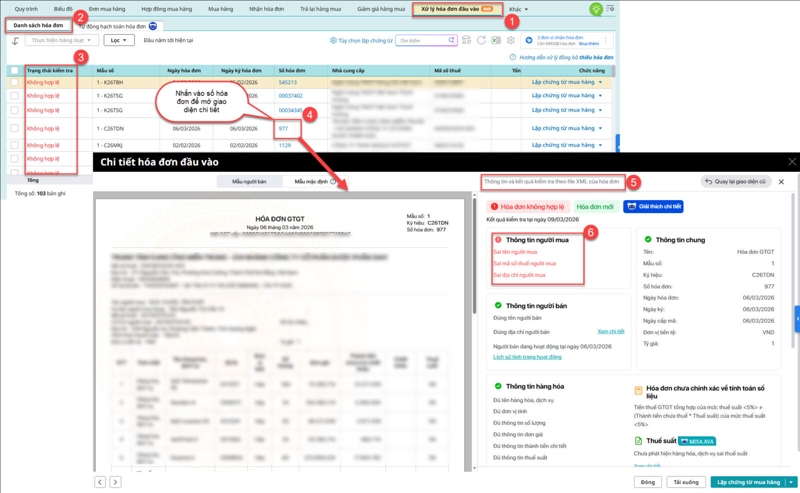 • Để xem chi tiết thông tin nào sai, không hợp lệ, Anh chị nhấn vào số hóa đơn trên danh sách để mở giao diện chi tiết hóa đơn, sau đó xem thông tin không hợp lệ tại mục Thông tin và kết quả kiểm tra theo file XML của hóa đơn