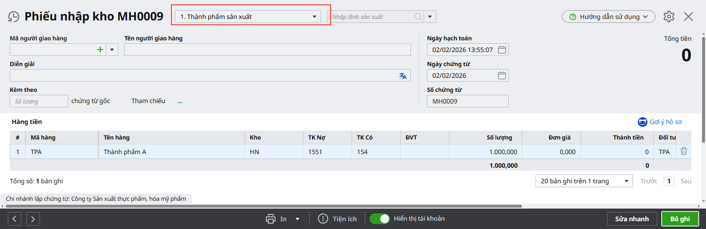 Bước 4: Sau khi chỉnh sửa xong, xóa kỳ tính giá thành cũ, thực hiện tính giá thành và kiểm tra lại phiếu nhập. Nguyên nhân 3: Chứng từ nhập kho thành phẩm chọn nhầm loại phiếu nhập kho khácBước 1: Vào bánh răng Các tiện ích và thiết lập\ Kiểm tra, đối chiếu chứng từ, sổ sách\ 9.Giá thành. Nhấn Kiểm tra, đối chiếu chứng từ, sổ sách. Bước 2: Tại mục 9.2 Trong kỳ có nhập kho thành phẩm nhưng nhập nhầm sang loại phiếu nhập kho khác… sẽ hiển thị các chứng từ chọn nhầm phiếu Bước 3: Kiểm tra chứng từ Nhập kho thành phẩm đang cảnh báo trên danh sách. Chọn về đúng loại 1. Thành phẩm sản xuất