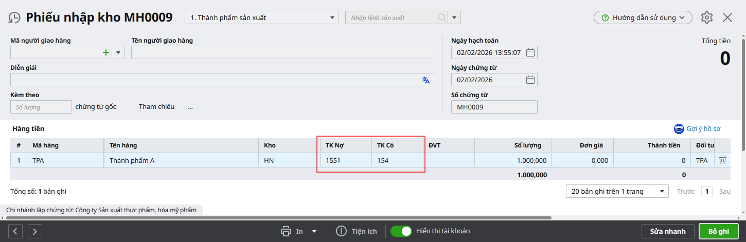 Bước 4: Sau khi chỉnh sửa xong, xóa kỳ tính giá thành cũ, thực hiện tính giá thành và kiểm tra lại phiếu nhập. Nguyên nhân 4: Chứng từ nhập kho thành phẩm hạch toán khác Nợ TK 15x/Có TK 154Bước 1: Vào bánh răng Các tiện ích và thiết lập\ Kiểm tra, đối chiếu chứng từ, sổ sách\ 9.Giá thành. Nhấn Kiểm tra, đối chiếu chứng từ, sổ sách. Bước 2: Tại mục 9.3 Trong kỳ có nhập kho vào loại phiếu nhập kho thành phẩm nhưng hạch toán sai (hạch toán khác Nợ TK 15x/Có TK 154) hoặc sai đối tượng tập hợp chi phí… sẽ hiển thị các chứng từ hạch toán sai. Bước 3: Kiểm tra chứng từ Nhập kho thành phẩm đang cảnh báo trên danh sách. Chọn về đúng hạch toán Nợ TK 15x/Có TK 154
