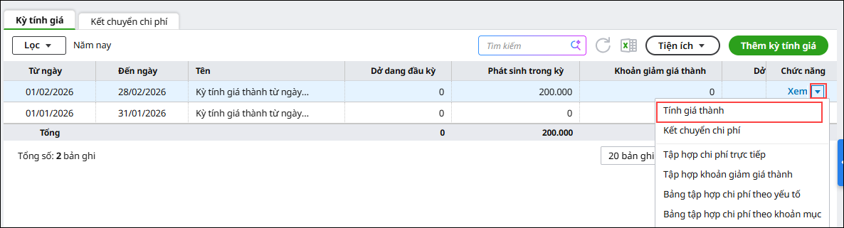 Nguyên nhân 1: Thành phẩm có tính giá thành nhưng chưa cập nhật giá nhập kho trên kỳ tính giá hoặc tự nhập đơn giá trên phiếu nhập khoBước 1: Vào phân hệ Giá thành, chọn kỳ tính giá thành có sai sót Bước 2: Tại cột Chức năng nhấn biểu tượng mũi tên (▼) cạnh nút Xem. Nhấn Tính giá thành
