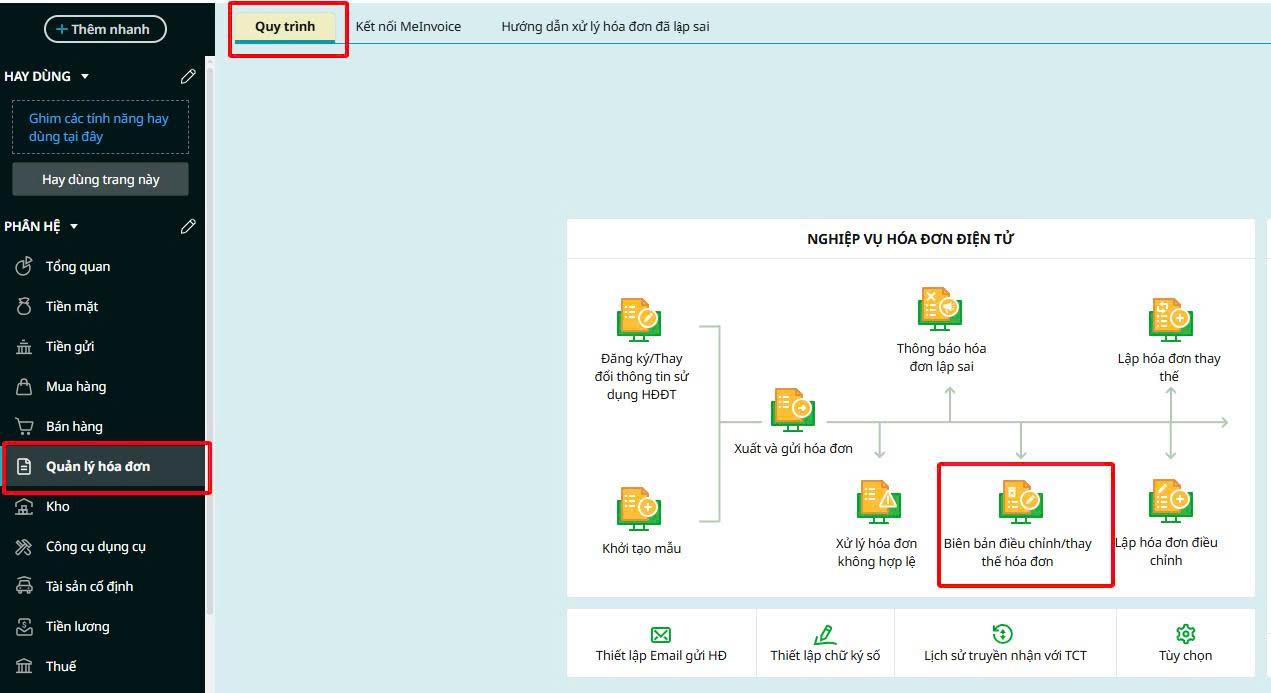 Bước 1: Vào phân hệ Quản lý hóa đơn\ Quy trình\ Biên bản điều chỉnh hoặc thay thế hóa đơn để lập biên bản tương ứng.