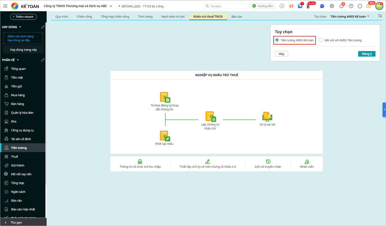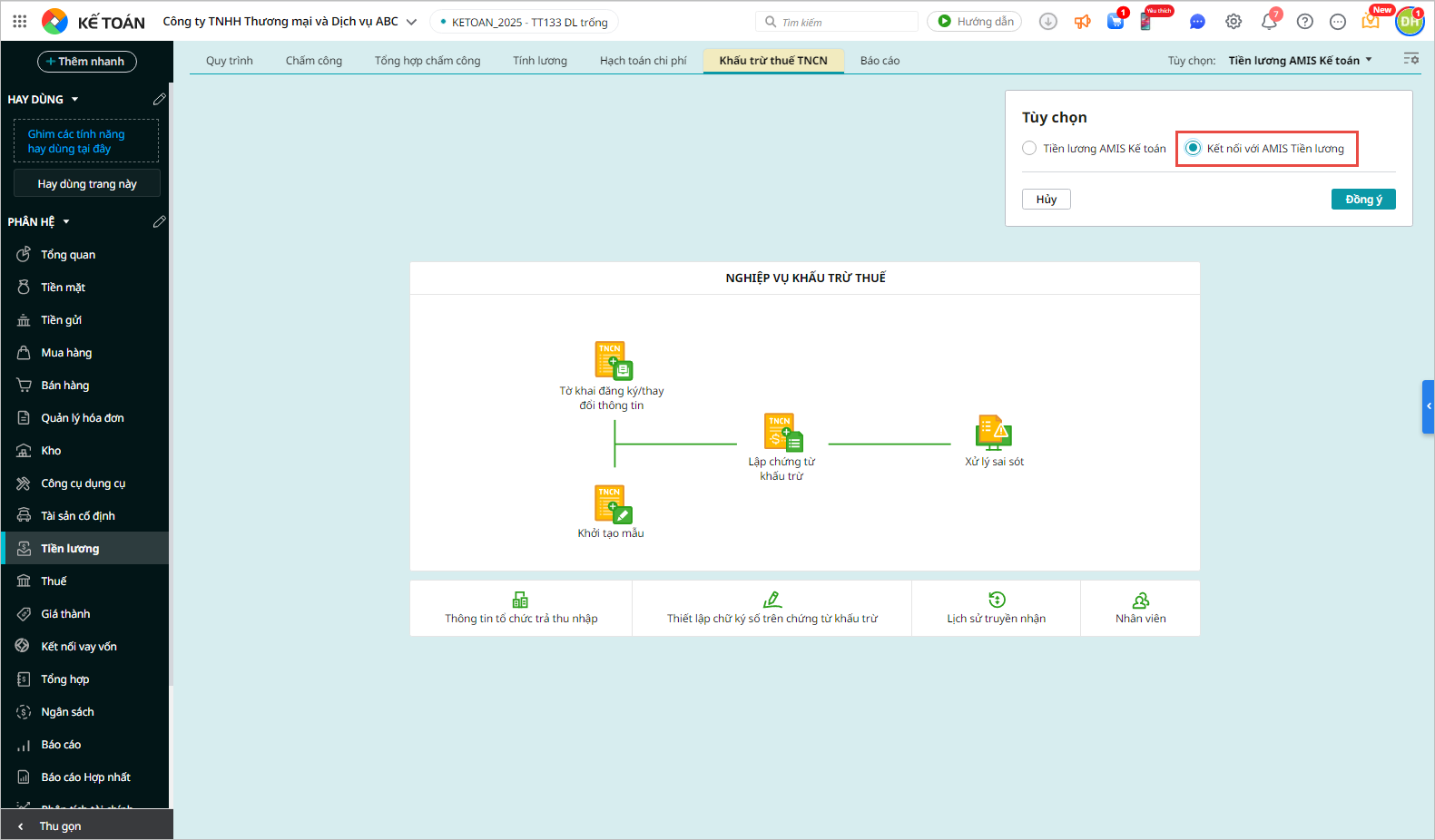 Lập chứng từ khấu trừ thuế TNCN 1. Trường hợp người dùng sử dụng phân hệ tiền lương trên AMIS Kế toán Tích chọn tùy chọn Tiền lương AMIS Kế toán: Lập chứng từ khấu trừ thuế TNCN theo hướng dẫn tại đây. 2. Trường hợp người dùng sử dụng AMIS Tiền lương Tích chọn Kết nối với AMIS Tiền lương: Lập chứng từ khấu trừ thuế TNCN theo hướng dẫn tại đây. Lượt xem: 68 Cập nhật 11/06/2025 Bài viết này hữu ích chứ? Có Không Nền tảng quản trị doanh nghiệp hợp nhất MISA AMIS với gần 200.000 khách hàng doanh nghiệp đang sử dụng Phần mềm Kế toán Phần mềm Quản lý Nhân sự Phần mềm Quản lý Marketing Phần mềm Quản lý Bán hàng Phần mềm Quản lý Công việc - Dự án Giúp nâng cao hiệu quả hoạt động kinh doanh và mở rộng quy mô Bài viết liên quan Xử lý hóa đơn MTT – đã gửi/chưa gửi CQT- Đã gửi người mua – sai tên, địa chỉ người mua, không sai nội dung khác Xử lý hóa đơn không mã – chưa gửi hóa đơn đến CQT qua BTH – đã gửi người mua – sai tên, địa chỉ người mua Xử lý hóa đơn không mã – đã gửi hóa đơn đến CQT qua BTH – đã gửi người mua – sai tên, địa chỉ người mua Xử lý hóa đơn không mã – đã chuyển đầy đủ nội dung đến CQT – Đã gửi người mua – Sai tên, địa chỉ người mua Xử lý hóa đơn có mã – đã gửi người mua- sai tên, địa chỉ người mua, không sai MST và các nội dung khác Hướng dẫn xử lý hóa đơn sai sót do thiếu tổng tiền thuế Giải đáp miễn phí qua FacebookNếu bạn vẫn còn thắc mắc hãy đăng câu hỏi vào Cộng đồng MISA qua facebook để được giải đáp miễn phí và nhanh chóngĐăng bài ngay