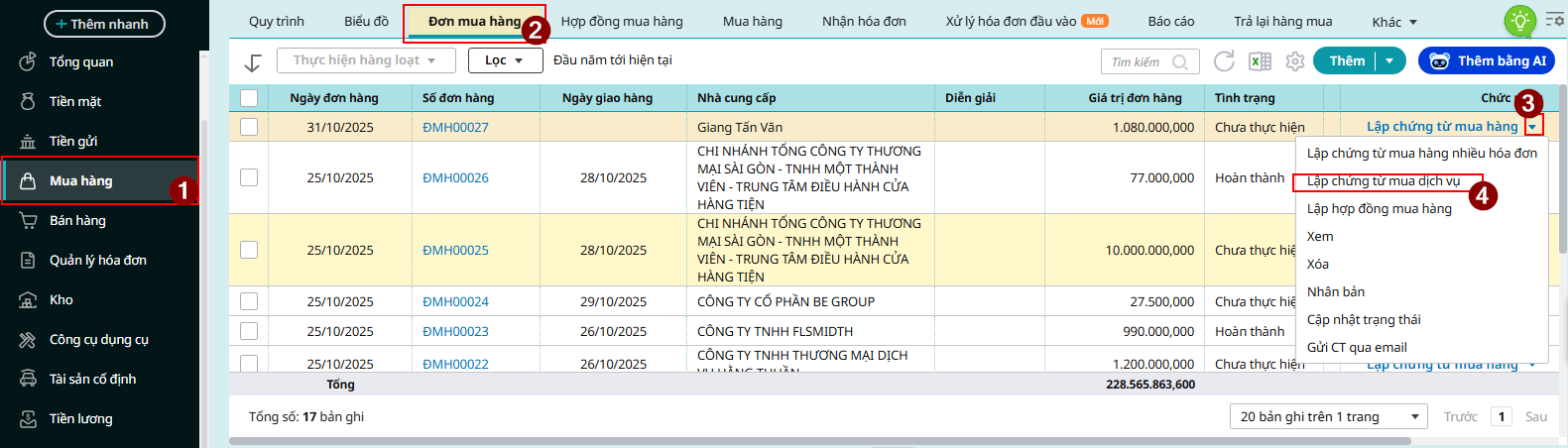 - Cách 1: Với các đơn mua hàng đã lập trước đó, anh/chị vào phân hệ Mua hàng\Đơn mua hàng, Tại cột Chức năng nhấn mũi tên ∇ chọn lập chứng từ mua dịch vụ