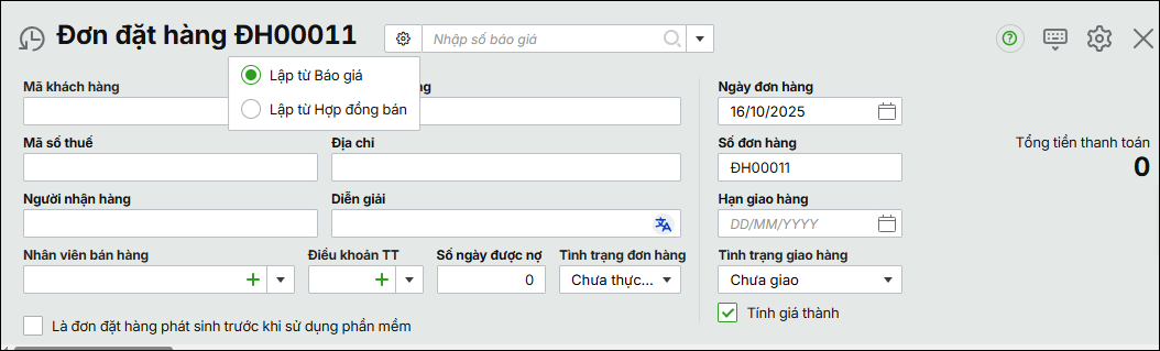 - Hệ thống sẽ tự động lấy thông tin khách hàng và hàng hóa từ báo giá sang đơn đặt hàng