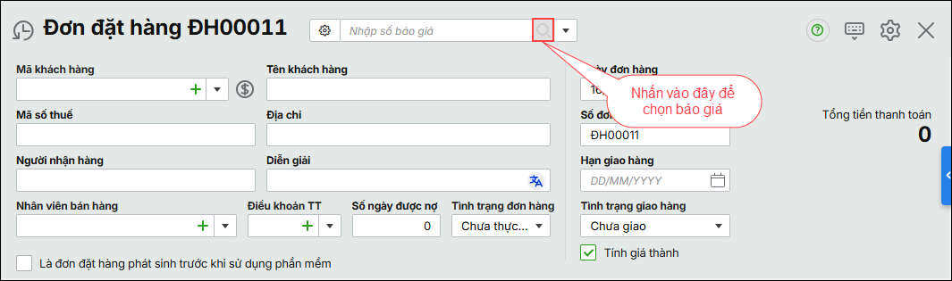 Bước 2: Nhấn vào biểu tượng kính lúp tại trường Báo giá để chọn báo giá cần sử dụng.