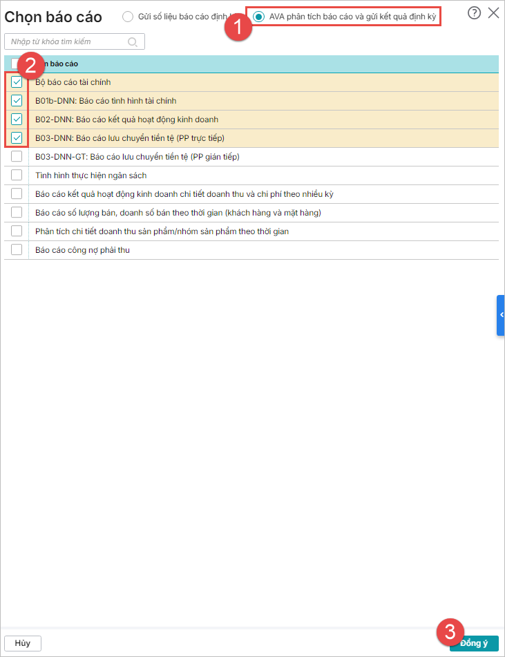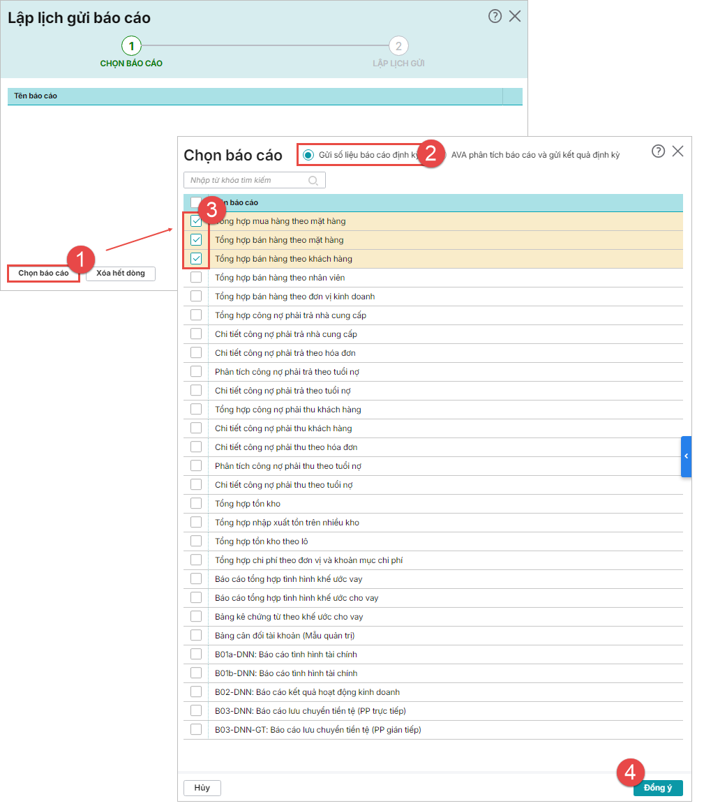 Bước 2: Nhấn Chọn báo cáo, chọn Gửi số liệu báo cáo định kỳ, chọn các báo cáo cần gửi email định kỳ, nhấn Đồng ý: