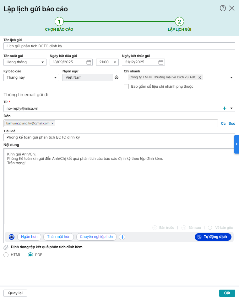 Bước 4: Nhập tên lịch gửi, sau đó thiết lập tần suất gửi báo cáo hàng ngày/hàng tuần hoặc hàng tháng tùy theo nhu cầu của đơn vị: