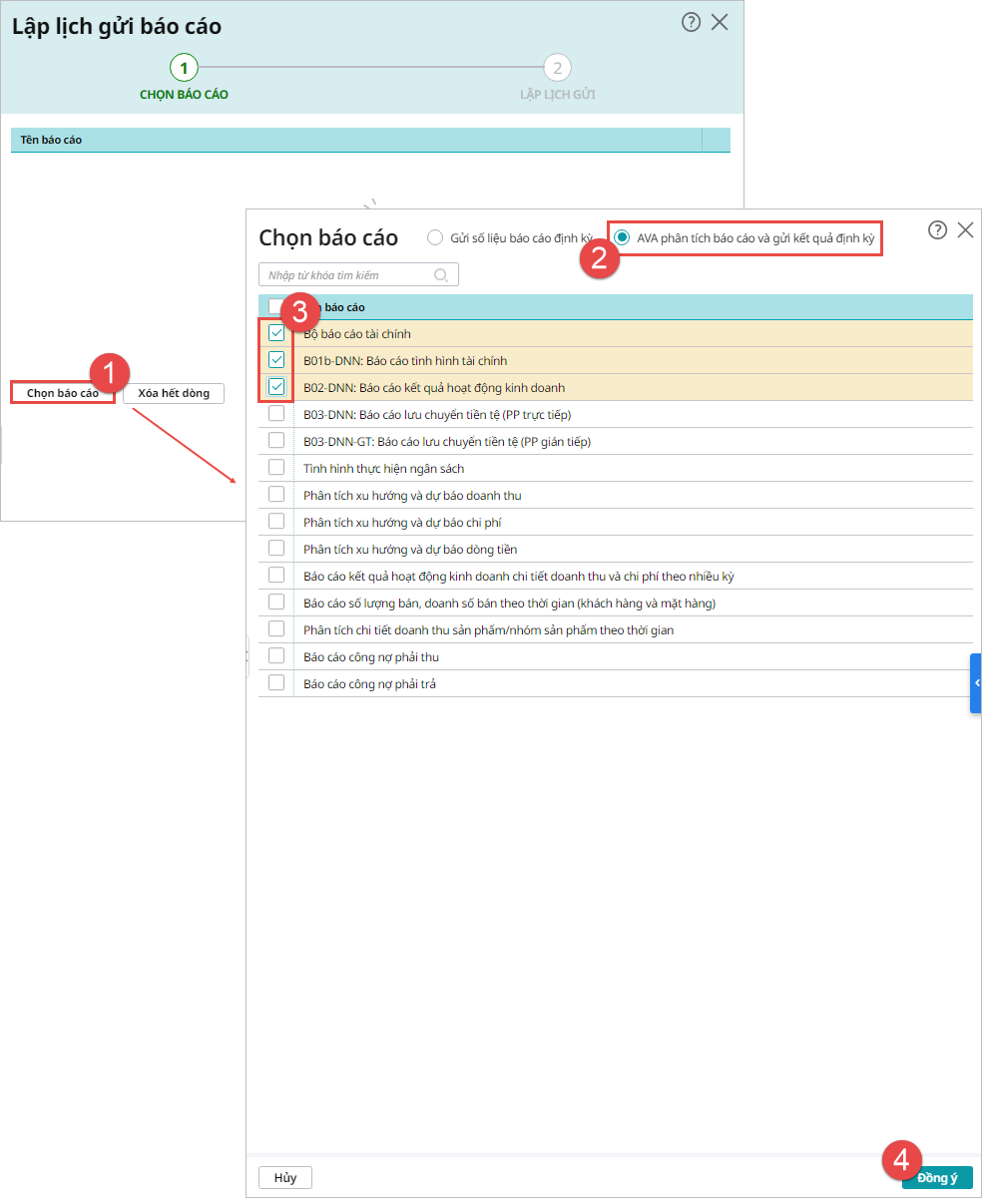 Bước 2: Nhấn Chọn báo cáo, chọn AVA phân tích báo cáo và gửi kết quả định kỳ, tích chọn các báo cáo cần gửi email định kỳ, nhấn Đồng ý: